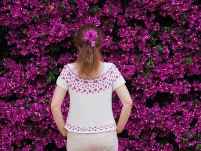 Syrtos top is a circular short sleeve yoke that is worked seamlessly from the top down. The neck is worked first, after that, several series of short rows are used for a comfortable and beautifully shaped finish.