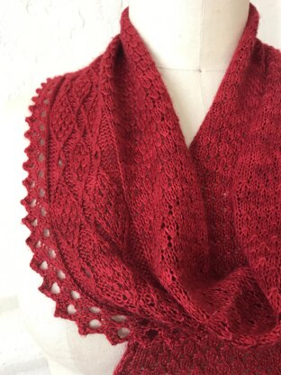 Yarn Dragonfly Fibers Dharma, 50% yak / 50% mulberry silk (480 yds / 439 m per 4 oz / 113 g), 1 skein of Dragonberry. As shown shawl used approx 442 yds / 404 m.
