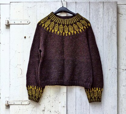 Talikko is worked seamlessly top down. The corrugated ribbing at the folded collar and cuffs is continued in the stranded stitch pattern, which can be worked with either two or one contrast colours.