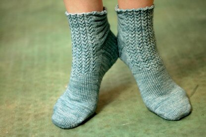 These short but very sweet toe-up socks begin with my favorite round toe and feature a beaded openwork rib, a sculpturally fitted back, and just a hint of beaded ruffle at the top. Inspired by a wonderful family reunion that took place in July 2010 near Tallulah Falls in North Georgia, the first sock was improvised and finished on the plane trip home. The first pair was a gift for my mother and her pair contain no beads, but my pair had to have them! The beads, inset into the openwork rib pattern in the front and around the top rim of the sock, give an impression of sparkling water drops that catch the light now and then.. a lovely effect.