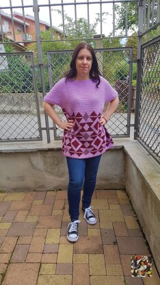 A sweater, with short sleeves, crocheted using the tapestry technique. The pattern is suitable for intermediate crocheters. Since I decided to create an 'oversize' version, I did not develop any other sizes as the one made fits from an S to an L (a size S will still be wider of course than an L). I recommend the use of two yarns in contrasting and very different colours in order to make the final design stand out.