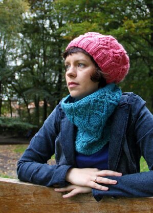 Tapti Cowl and Tapti Hat are two quick, but impressive looking knits in a bulky weight yarn. They are knitted in the round and come with both charted and written instructions. A meandering lace design creates an alluring all-over texture with an oriental feel. Hat and cowl together make a flattering and comfortable winter set.