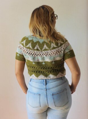 Taroko is a colorful short sleeve sweater with a round yoke and lace elements throughout. It was inspired by its namesake, Taroko National Park in Taiwan and its lush green mountains and waterfalls, which are bursting with life and beauty. The body of the sweater can be made cropped or as long as you want and the neck is wide for extra comfort.