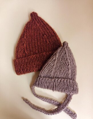Description: This beanie is constructed with a folded Brim and a body worked in 1x1 rib. Shaping begins immediately after the Brim with four spiraling decrease lines that form a conical body. The hat is finished with a small stem at the top.