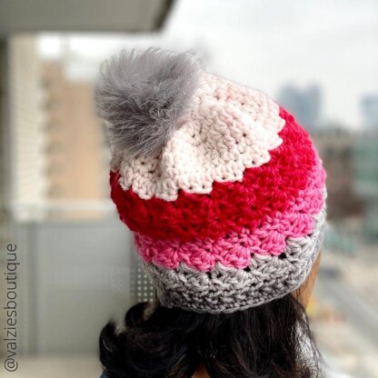 This is a top down beanie hat worked in the round with no seams. Intermediate to Advanced Beginner – knowledge of basic stitches needed as well as - working in the round, back loops only, decreases such as sc2tog, working in a back loop only, and multiple stitches into one stitch. Adult or Teen / One Size - finished size is 9 1/2" Wide x 10 " length, and does stretch. I think it would look fabulous in black, navy, white, the amazing rust fall colors, or multicolored - and of course different poms will give it a totally new look as well for that finishing luxury feel.