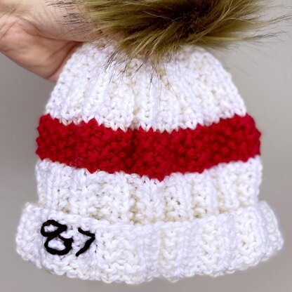 My Sideline Spirit Hat Knitting Pattern is inspired by the handmade beanie gifted to Taylor by Kut the Knit, which was crocheted in Travis’ Kansas City Chiefs team colors, complete with his jersey number embroidered on its brim.