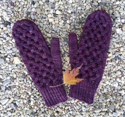 These Mittens are knitted in the round from the bottom of the cuff to the top of the mitten. A beautiful cable pattern adorns one side of the mitten, while the stitches across the palms are worked in Reverse Stockinette Stitch.