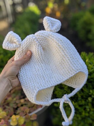 Teddy Bear Baby Knit bonnet has simple and cute design. Bonnet is knitted back and forth that is why can be perfect as for beginners and advanced knitters.