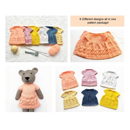 These lovely little knitted teddy or dolls dresses are worked top down and knit up very quickly and with six different designs to choose from you will be spoilt for choice as to which one to make first!