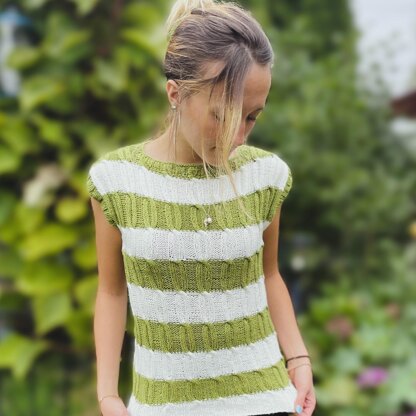 This was an interesting pattern to design and knit. The horizontal stripes and vertical cables create a pleasing design. This short sleeve tee looks great over a long sleeved tee shirt in cooler weather. Line Yarn from Sandnes Garn is a combination of soft cotton and cool linen. The texture is quite unique. Using circular needles, this short sleeved tee is knit in the round from the bottom hem to the underarms. The front and back are then separated and completed using straight needles. Additional stitches are cast on for a short sleeve. The shoulder shaping is done using a few short rows. When the shoulders have been seamed, stitches are picked up around the sleeve and a short cuff is made.
