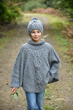 Temptation poncho and hat set is stylish and super cosy clothing for your little one. It is designed to keep your little one away from wind and cold. It is quick and fancy project for those who love cables. Thick yarn and large size of knitting needles make this project quick and easy to knit. The poncho is knitted bottom up as four parts and collar is knitted in the round before all parts are sewn together. The hat is knitted in the round and decorated with a large pompom.