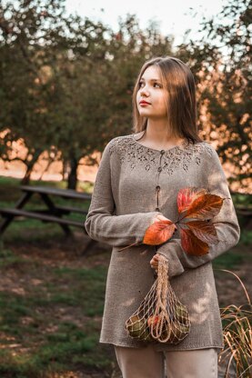 “Tendy” cardigan is worked from the neck down completely seamless. The circular yoke features a lace pattern which echoes in the side lace inserts creating the A-line shape of the garment. The sleeve has a lace path inside of the sleeve in continuation of the side lace panel at the body of the garment.