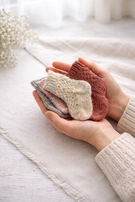 These baby socks are worked in the round from the cuff down and feature a classic heel flap and gusset construction. The stitch pattern is simple and easy to follow, making this pattern suitable for beginners.