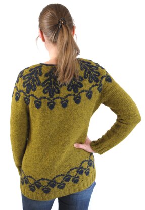 Deriving its name from the Finnish word for acorn, Terho is a comfortable colorwork sweater with oak leaves and hanging acorns on the round yoke. This DK-weight sweater is worked in one piece from the top down.