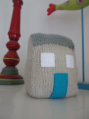 This is a pattern for a terraced house ornament. It is knitted in stocking stitch with a garter stitch roof, in 6 pieces. It is stuffed with toy stuffing and has felt applique for the door and windows. A piece of card is used for the base. A row if these in different colours would make an interesting feature for any room. Any dk yarn can be used.