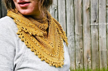 Yarn: Both sizes shown in Camelspin by Handmaiden (70% silk, 30% camel) Small: Approx 260 yards fingering-to-sport weight yarn (shown in Gold and Amethyst) Large: Approx 350 yards fingering-to-sport weight yarn (shown in Moss) Gauge: (before blocking) BUT, since this is a shawl, gauge is not super-important Small: 24 sts over 4"/10cm in stockinette Large: 22 sts over 4"/10cm in stockinette Needles: Small: US4 (3.5mm) circular (24" or 32") Large: US5 (3.75mm) circular (24" or 32") Notions: Stitch markers, darning needle Skill level: Enthusiastic beginner Finished Measurements: (after blocking) Small: 46" wide, 16" d