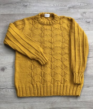 A classic fitting sweater with a wonderfully effective textured, geometric diamond pattern on both the front and back. Complimented by a wide rib patterning on the sleeves. Gorgeous in this wool/acrylic mix yarn, but any smooth chunky will work very well too.