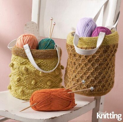 This is a pattern for two textured project bags, originally published in Simply Knitting. The first is in a flight of the bumblebee stitch, the second zig zag and bobbles. Both have stocking stitch circular bases knitted flat, garter stitch top borders. They have lining and wadding, and faux leather handles. These are fine for a beginner able to do make a stitch, and bobbles. Photos Simply Knitting.
