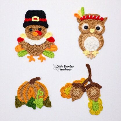 Written in English using US terminology. Set includes 4 patterns : 1. Turkey 2. Native Owl 3. Pumpkin 4. Acorn Materials: • 4 Ply Fingering Acrylic Yarn • Crochet Hook Size 3 mm • flat bottom black eyes Skill level: Easy