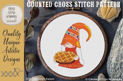 An Adorable Thanksgiving Pie Gnome counted cross stitch design!\nCross Stitch Pattern designed by Marcia Manning.\n82 stitches wide by 100 stitches high.\nPDF is a COLOR counted cross stitch chart which lists suggested DMC floss colors, and includes a color picture.\n\nStitched design size is as follows:\nSize 11 count: 7.45 x 9.09 inches or 18.93 x 23.09 cm\nSize 14 count: 5.86 x 7.14 inches or 14.88 x 18.14 cm\nSize 16 count: 5.13 x 6.25 inches or 13.02 x 15.88 cm\nSize 18 count: 4.56 x 5.56 inches or 11.57 x 14.11 cm\nSize 22 count: 3.73 x 4.55 inches or 9.47 x 11.55 cm
