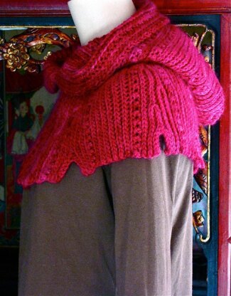 Luxuriously roomy, stretchy, warm and squishy, I designed the Thaxton Cowl to keep one's upper back and chest toasty whether it's worn like a collar or unfurled into a hood. I can't imagine a better stitch for it.