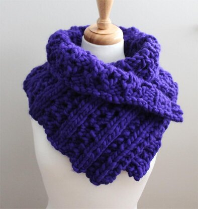 This scarf is cozy, warm and very versatile. It can be worn as a scarf, shawl or cowl. It is knit with a bulky weight yarn at 2 stitches per inch on a US #15 needle. The open stitch pattern gives a lot of nice texture and keeps it from feeling too heavy. you can wear this scarf long and flat or wrap it and pin it for a cowl. It even looks great slightly draped over the shoulder as a shawl or capelet. The finished measurements are 10" x 24".