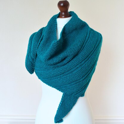 Design: A wide asymmetrical triangular scarf/shawl knitted mainly in garter stitch with side shaping and a garter/stocking stitch pattern on the wider section.