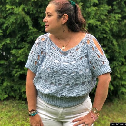 The Aria Top is a bat sleeve cold shoulder top, crocheted on one piece, starting from the bottom to the neck, and then continued on to the front. It is seamed on the sides and on then attached on the round for the waist and sleeve sc-ribbing.