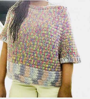This pattern is for a loose fitting crop sweater for women size medium or large, with hint on how to modify it to a smaller size