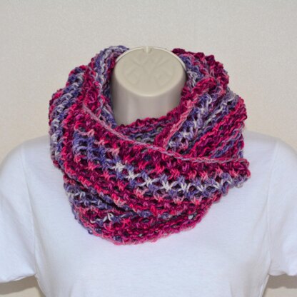 Design: A self-patterning knit in the round infinity scarf worked on larger than average needles for a loose-knit drapey effect