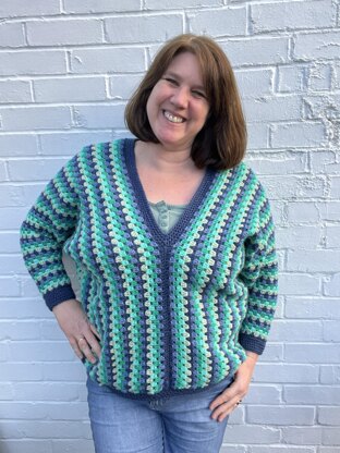 Make this beautiful jumper! Guaranteed to flatter any body shape, the v jumper has a simple construction with a ‘v’ at the front and back. You can choose how deep you would like the ‘v’ to be on both front and back when you come to assemble it. Choose between batwing or straight sleeves.