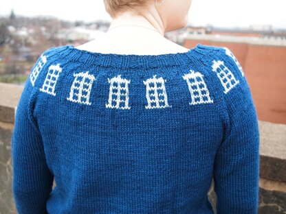 The Doctor’s Wife is a bottom-up pullover, knit in the round, featuring a colorwork motif of the T.A.R.D.I.S. The only finishing is underarm grafts and weaving in ends. It has a feminine silhouette due to optional waist shaping and a slightly wider neckline.