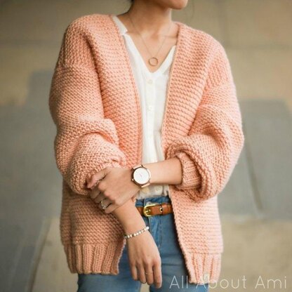 Knit this gorgeous slouchy cardigan using bulky yarn and the relaxing garter stitch! The Downtown Cardigan is a chunky cardigan that looks so chic with its baggy sleeves, bold ribbing and well-defined stitches. This statement cardigan works up very quickly and is perfect for beginners! Bulky level 5 yarn called "Color Made Easy" by Lion Brand Yarn is used. Sizing is included for Extra Small/Small, Medium/Large, XL/2X and 3X/4X.