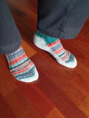 THE DUKE asked the WEE DUCHESS to knit him some socks that would be colourful, really cosy and not too thick around the leg; but, could they be made with thicker heels, soles and toes so they won’t make holes after a few wearings? and, could they not be too tight across the ankles? OF COURSE! Said the Wee Duchess, this can be done, and here you are. Socks made with a single strand of self-striping sock yarn for the instep, in an easy twist pattern, but the heel, sole and toe are worked in stocking stitch using 2 strands held together of a contrasting yarn. The Wee Duchess has invented a simple method of using wraps and turns to achieve this. The ‘Strong’ heel construction knitted with 2 strands of yarn ensure a nice big roomy heel box with a very comfortable fit for a man, or also for a woman with a high instep. The different tensions are compensated by inserting optional additional rows for the instep. The Duke said, ‘Thank you my dear, these are the very best socks ever’.