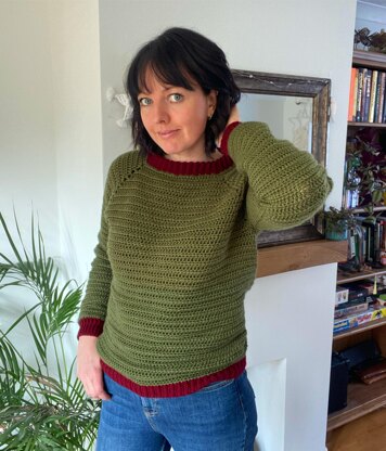 A raglan style, slightly fitted comfy sweater in half double crochet (hdc) that is suitable for confident beginners. The pattern has lots of notes and pictures to help beginners try out this style of sweater.