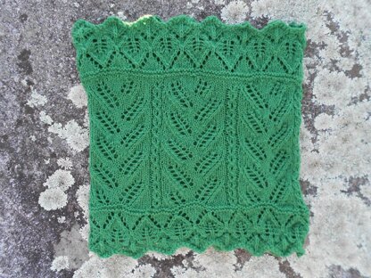 This enchanting neck cozy will keep you warm during those chilly days. Knitted with Fingering weight yarn makes this light and airy, yet, it adds warmth. Featuring a leafy border, and delicate fern stitch, accented by the mock cable stitch, this pattern is fun to knit. There are written as well as charted instructions. Enjoy!