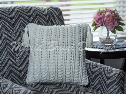 The Florentine Pillow cover is exquisitely textured by using Front Post Treble Crochet stitches combined with Cable stitches creating a very rich texture. In keeping with the repeat row count and stitches, this pillow cover can be made to any desired size. The yarn used is Herrschners #5 Bulky Plush in white.