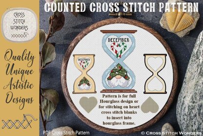 THE GNOMES OF TIME!\n\nCross Stitch Designs by Marcia Manning.\n\nEach design features 2 heart designs - one regular and one upside down, which are within an Hourglass! \n\nThe "FULL/ENTIRE" Hourglass design has been designed to be stitched on one's fabric of choice.\nThe Hourglass fully stitched design is 59 stitches wide by 100 stitches high.\n\nThe hearts are designed to fit my HOURGLASS FRAME.\n\nThe frame has a heart and an upside down heart opening, where you stitch the heart design on our heart blanks and then insert into the Hourglass Frame!\n\nA wonderful interchangeable project!!\n\nThe hearts by themselves are 43 stitches wide by 39 stitches high.\n\nThe Hourglass Frame (approximately 4.25" x 7.25") and Heart Blanks are from my "Cross Stitch On Blanks" line. \n\nFull Hourglass Design: 59 x 100 \n11 count: 5.36 x 9.09 inches or 13.62 x 23.09 cm\n14 count: 4.21 x 7.14 inches or 10.70 x 18.14 cm\n16 count: 3.69 x 6.25 inches or 9.37 x 15.88 cm\n18 count: 3.28 x 5.56 inches or 8.33 x 14.11 cm\n\nThe Heart Alone Designs: 43 x 39\n11 count: 4.2 x 3.9 inches or 10.5 x 10.0 cm\n14 count: 3.3 x 3.1 inches or 8.4 x 7.8 cm\n16 count: 2.9 x 2.7 inches or 7.3 x 6.8 cm\n18 count: 2.6 x 2.4 inches or 6.5 x 6.1 cm