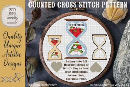 THE GNOMES OF TIME!\n\nCross Stitch Designs by Marcia Manning.\n\nEach design features 2 heart designs - one regular and one upside down, which are within an Hourglass! \n\nThe "FULL/ENTIRE" Hourglass design has been designed to be stitched on one's fabric of choice.\nThe Hourglass fully stitched design is 59 stitches wide by 100 stitches high.\n\nThe hearts are designed to fit my HOURGLASS FRAME.\n\nThe frame has a heart and an upside down heart opening, where you stitch the heart design on our heart blanks and then insert into the Hourglass Frame!\n\nA wonderful interchangeable project!!\n\nThe hearts by themselves are 43 stitches wide by 39 stitches high.\n\nThe Hourglass Frame (approximately 4.25" x 7.25") and Heart Blanks are from my "Cross Stitch On Blanks" line. \n\nFull Hourglass Design: 59 x 100 \n11 count: 5.36 x 9.09 inches or 13.62 x 23.09 cm\n14 count: 4.21 x 7.14 inches or 10.70 x 18.14 cm\n16 count: 3.69 x 6.25 inches or 9.37 x 15.88 cm\n18 count: 3.28 x 5.56 inches or 8.33 x 14.11 cm\n\nThe Heart Alone Designs: 43 x 39\n11 count: 4.2 x 3.9 inches or 10.5 x 10.0 cm\n14 count: 3.3 x 3.1 inches or 8.4 x 7.8 cm\n16 count: 2.9 x 2.7 inches or 7.3 x 6.8 cm\n18 count: 2.6 x 2.4 inches or 6.5 x 6.1 cm