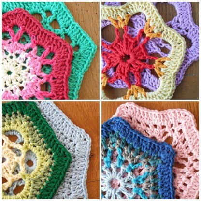 A collection of 7 hexagon designs that can be used together. The patterns are also available individually. Samples were made in rico Creative Cotton Aran, but the motifs could be made in any weight of yarn. Patterns are written in English and US crochet terms and charted. The ebook also includes suggested layouts for an afghan blanket and helpful tips on joining motifs.