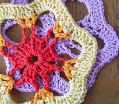 This motif is the fifth in the series of 7 in the Hexagon Project 2013. The theme for the Hexagon Project 2013 is lacy simplicity. All 7 designs can be found in the Hexagon Project 2013. All hexagons are designed to be the same size so that they can be joined together and used to create a blanket or a cushion, table runner…..use your imagination! They are written for one continuous colour but can be done in many colours by changing colour at the start of each round. The motifs are suitable for those fairly new to crochet who can crochet in the round. The size of each motif is 20 cm (8 inches) from point to point in aran weight yarn. But please note that I do crochet fairly loosely.