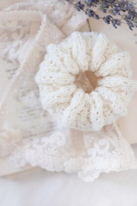 "Romantic, lacy stitches cascade beautifully, making The Honeysuckle Scrunchie a fun, quick, and delightful accessory to knit."