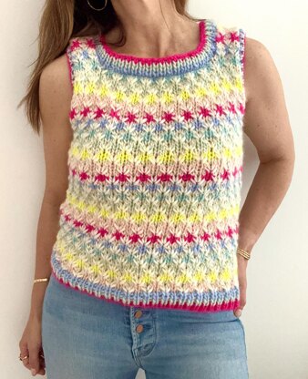 This is so fun and colorful with a simple but addictive stitch pattern. The color combinations are endless! You can also stick with 2 basic colors for a more traditional style. You can wear this alone as a tank or over a shirt as a vest. It is extremely versatile! Knit with a bulky weight yarn and a US# 11 needle. This pattern is written row by row. No charts.