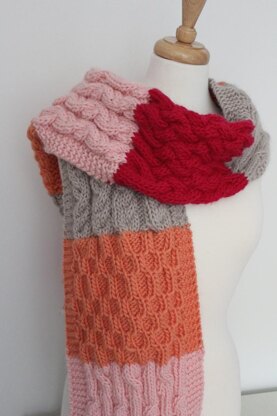 Another giant, cozy, and oversized super sampler scarf. This scarf is knit with cable patterns throughout it. It is knit with a chunky weight yarn and a US #11 needle. Each section is fun to knit, yet not overwhelming. This scarf can be worn wrapped around many times or just hanging long. It looks great with any style coat or jacket and the color combinations are endless. It can be knit an anything from darks or neutrals to neon brights. The sample used 4 different colors, as marked in pattern.