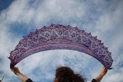This gorgeous shawl is an example of easy ‘lace knitting’ (i.e. the design row alternates with rows of plain knitting). Chart and written directions included. Crescent shaped with a stocking stitch body and a lace and pointed edge border. It is designed to be made from your favorite 50g ball of 2ply lace weight yarn. All the colors in my shawl are also found in the Australian native Lilly Pilly bush. It has vivid pink and purple berries, and new leaves that start off the softest pink before maturing to a rich green.