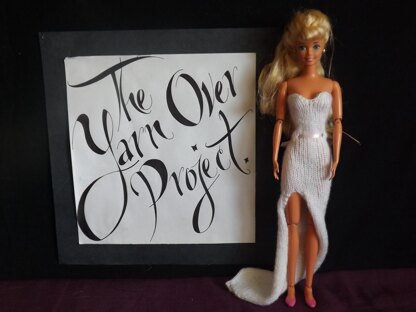 Barbie is ready to walk down the aisle in this hand-knitted strapless wedding dress, featuring featuring a train and ribbon belt. Modeled by the 1994 Gymnastics Barbie, this dress is made to fit the standard 11.5" high Barbie doll from Mattel. The skirt is knit in the round for a seamless design, and to allow the dress to slide on easily over Barbie's hips.