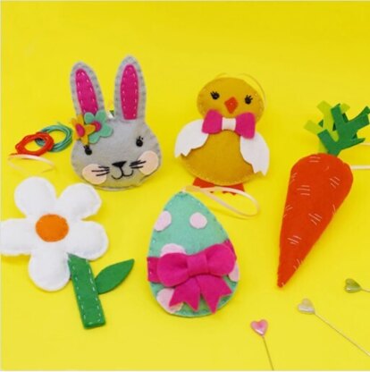 Nähe ein Häschen, ein Küken, ein Ei, Blumen und Karotten, um eine schöne Osterdeko zu kreieren – hänge sie an einer Girlande auf oder gestalte individuelle Dekorationen. Dieses Set ist für Anfänger geeignet und enthält alles, was du zum Nähen und Zusammenstellen der Deko benötigst. Inhalt jedes Sets: