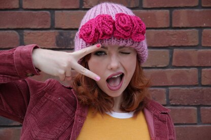 The hat is worked in 1x1 rib with the roses being knitted separately then sewn on.