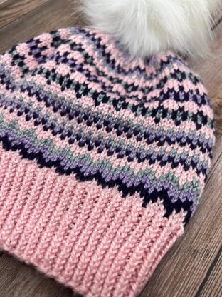 This gorgeous fair isle knit hat is just perfect with a set of ombre colorways. It is also great for stash busting. The colorwork would be described as advanced beginner, using 4 colors, but without the need to catch floats, making this pattern perfect for those learning how to do fair isle knitting hats. Available in 4 sizes, you can make a hat for anyone and everyone you love. The pattern includes a colorwork chart and decrease chart for ease of instruction.