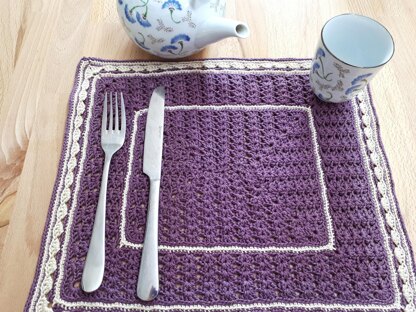 This elegant placemat uses the beautiful Iris stitch and is worked in a rectangle to create a nice texture. The use of a contrasting color creates a beautiful effect that emphasizes the pleasant texture of the placemat.